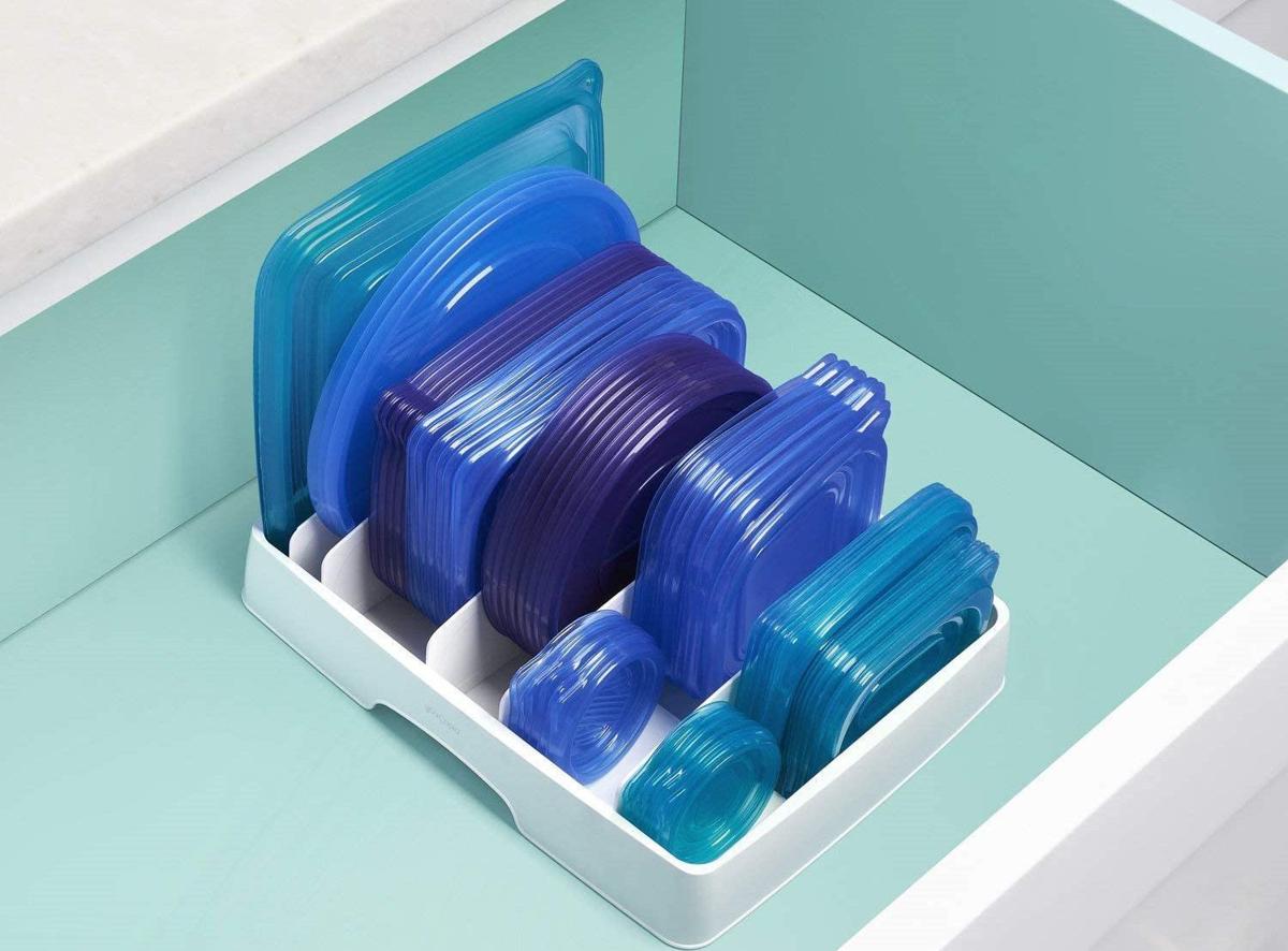 For all the storage container hoarders out there (yes mum, that means you), now you can stack your lids in the organizer as your storage containers fit nicely on the shelf. The dividers are adjustable so you can customize your set depending on what size containers you have.