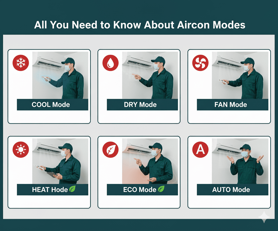 Using the right mode at the right time can cool your room faster, improve sleep quality, and reduce energy costs. Let’s explore each aircon mode and how to use them effectively.