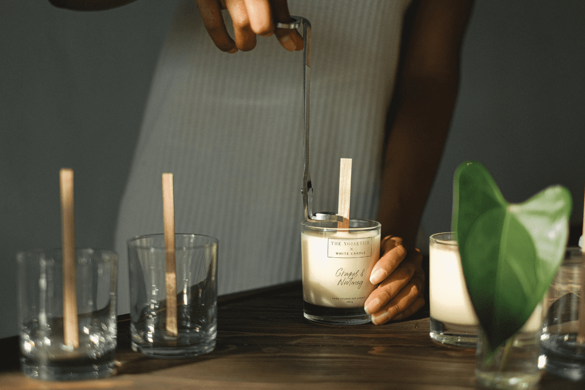 Before you light your candle, be sure to trim the wick. Using scissors, nail clippers or a wick trimmer, cut the wick down to about 3-6mm. This will help to prevent the flame from getting too big. If the flame gets too big, it can cause the wax to melt too quickly and cause a sooty mess all over the candle jar.